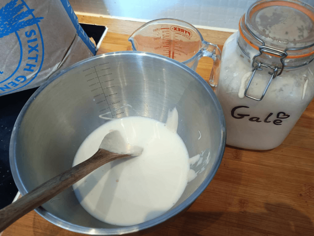 First, warm up your milk. You want it to feel above room temperature but not so hot you can’t place your hand in it comfortably. If you simply must measure it about 27°c and 29°c. To the warm milk add your leaven. Mix these together until it’s fully combined.