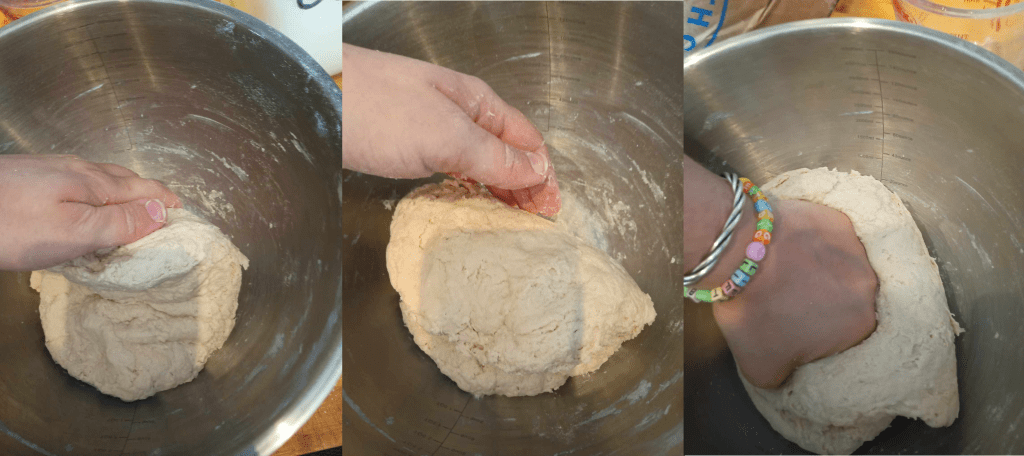 Once combined into a shaggy dough with the spoon you need to get your hands involved. If you get your palms or fingers involved too much you’ll find they get stuck pretty quick. Instead work the dough by ‘scooping’ and punching. Get your hand under the dough and lift and fold it in half; then punch this half flat.