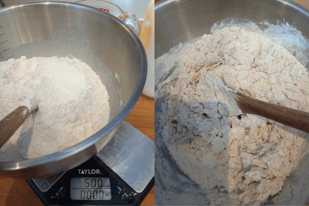 On top of your milk&leaven slop add the flour. And start mixing it into a dough with a sturdy spoon. Make sure to scrape the bowl constantly.