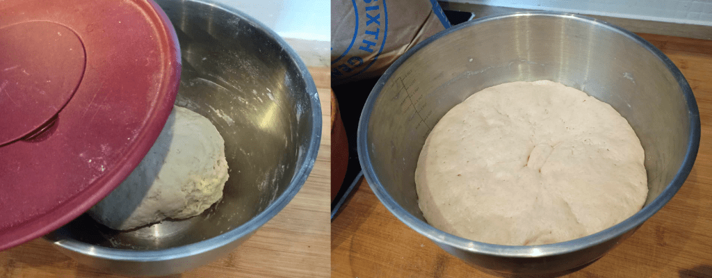 Keep going scooping and punching the dough until it’s relatively smooth. It doesn’t need to be perfect as the rest will allow the gluten to develop and smooth the dough out. Cover it up, and let it sleep overnight. The dough needs to sleep somewhere warm, I’ve read some historical recipes that suggest tucking it in next to the dead fire. If you don’t have a dead fire, a slightly warmed (BUT OFF!) oven, the airing cupboard, or near a radiator is a good spot.