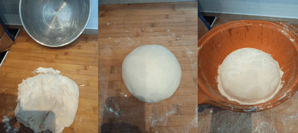 The next morning it should be roughly doubled in size, and helpfully stuck to the bowl. Scoop the dough out of the bowl onto a surface for kneading. I find it’s easiest to do this by dredging it with flour in the bowl and somewhat shoving the flour down the edges to stop it resticking itself. Once it’s out, start kneading the dough until it can hold it’s shape in a firm ball. Depending on the humidity of your house the dough will have varying levels of sticky, simply add flour until you get a good firm dough. I find it best not to throw flour at the ball itself, but to constantly ‘dip’ my hands in the flour bag.