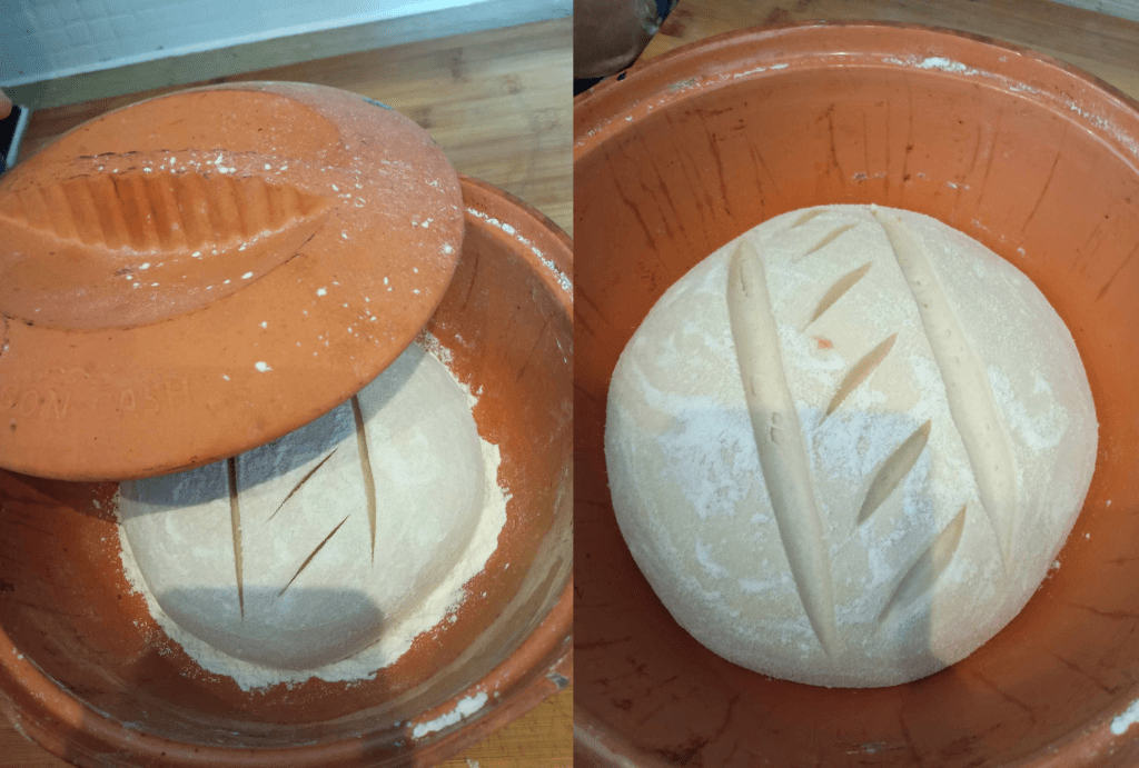 Preheat your oven to 200°c. Triple check it’s at temp then slide your bread in for about 1hour. If you want a softer crust have it covered with a lid, or foil for the first 20 minutes. You can add another cut at this point to encourage the bread to split along a guided path, but I find it misbehaves anyway.