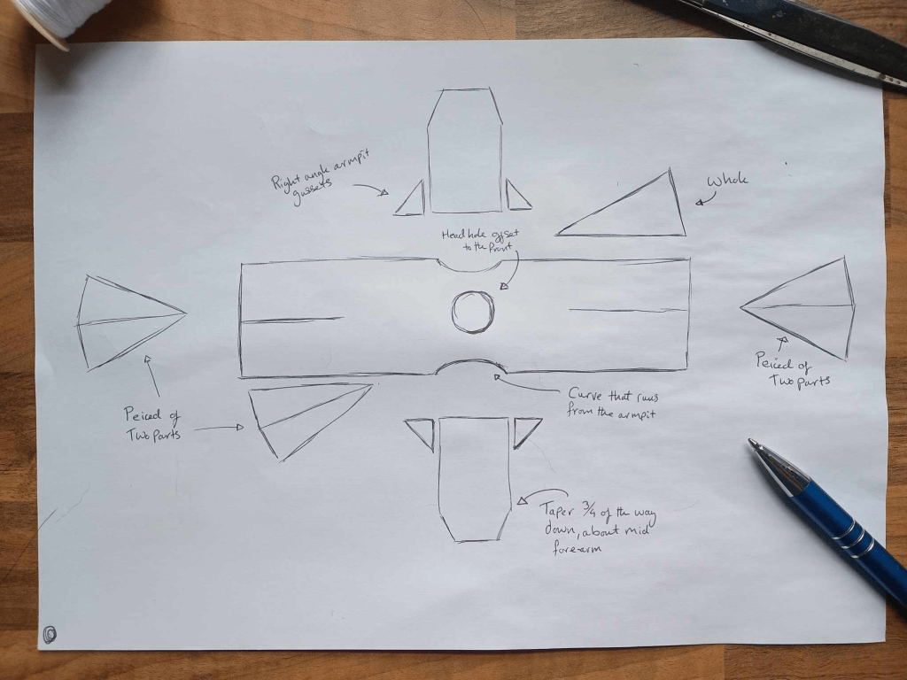 The Bocksten tunic was found in pieces, the linen that held it together had disintegrated while the wool stayed. This means we know exactly what pieces went into it. Breaking these down in the image below you can see how the design is very simple, with little aggressive tailoring.