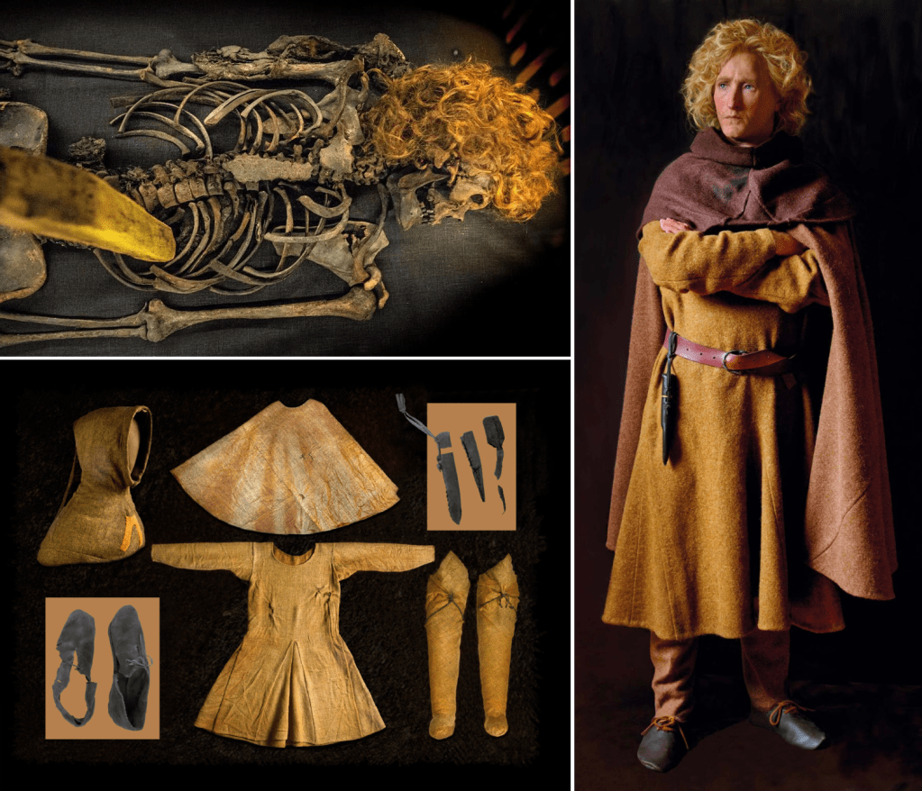 The Bocksten man was found with a wool; tunic, hose, and cloak, leather shoes, and two leather belts and two knives. His hood, also of wool, was found nearby. He also had ‘socks’ of scrap wool wrapped around his feet. Nothing else of note was found on his body, and it is concluded due to the manner of his burial he was murdered.