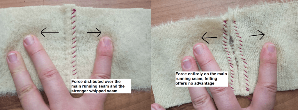 The felled seam I talk of, is after a running stitch is run, a whip stitch is done with the seam allowance to one side. This makes an incredibly strong seam. Distributing force over your initial running stitch, but also over a much stronger form of whip stitch.