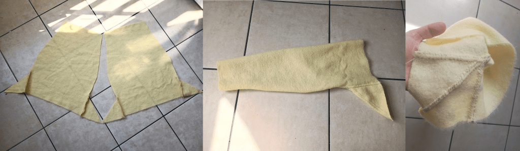 Next up the sleeves, The triangles are sewn to the sides of the sleeves so they resemble little rocket ships. Then the whole sleeve is folded in half and sewn shut. Note the felling is arranged to lap over internal corners and seal everything in.