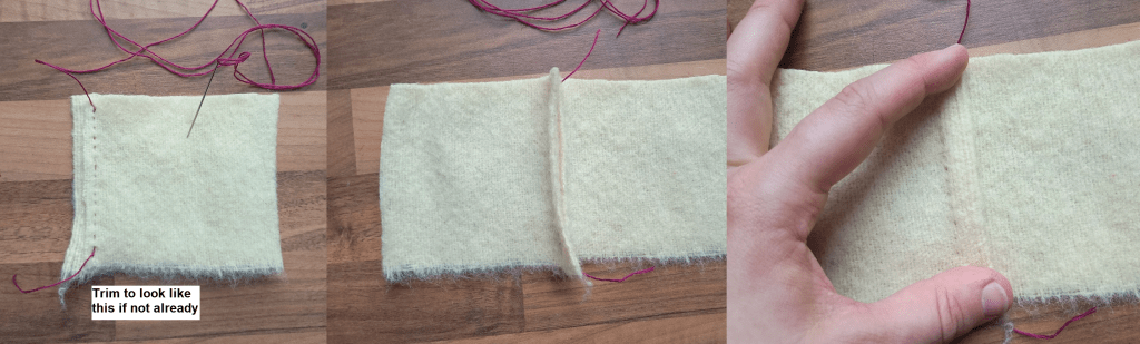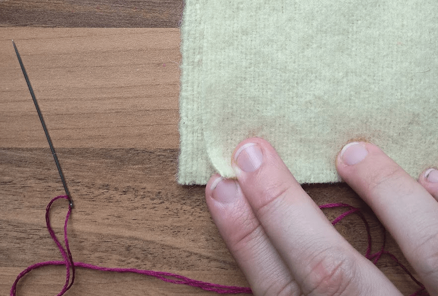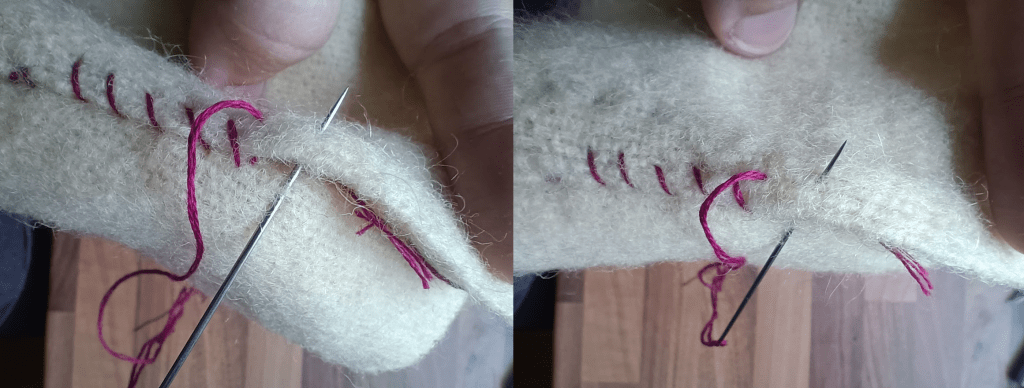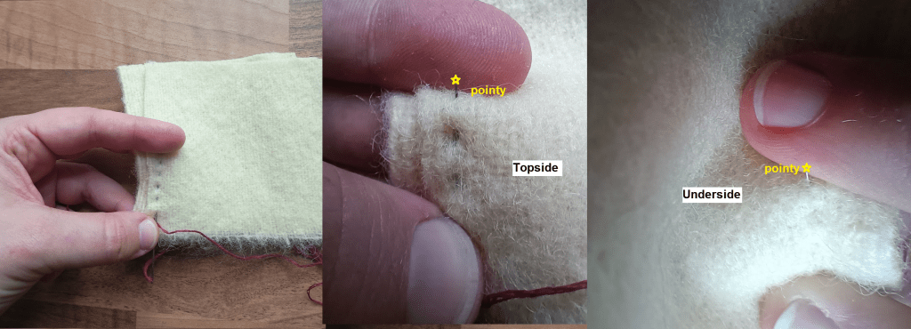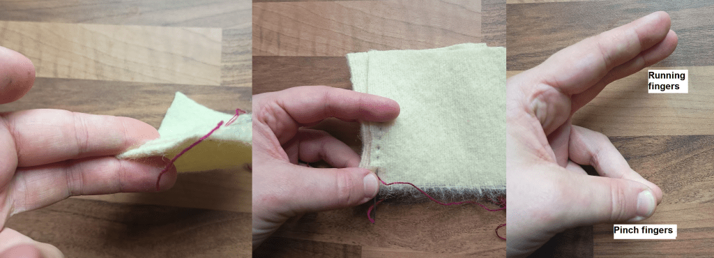 NOTE! This method will probably tear up your finger skin when you first start. Due to having to feel the needle point you can’t really do this with a thimble on. I advise getting a good working hands moisturiser and developing callouses.