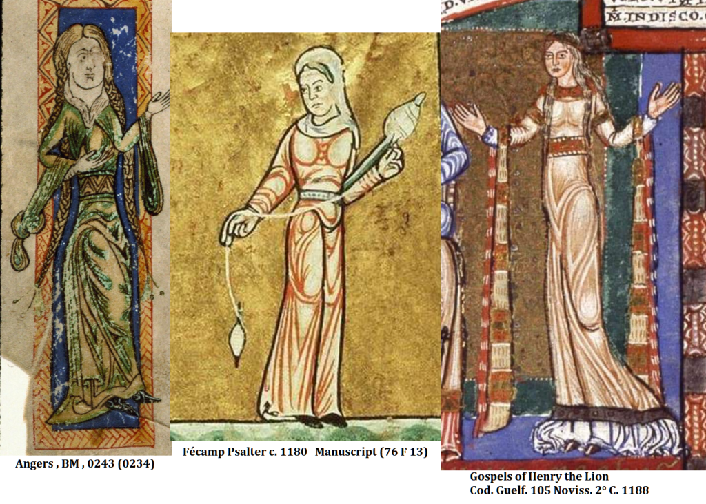 Other manuscripts can also be looked to; Throughout all my looking at ladies in 12th century illuminations I haven’t found any with embroidery down the chest. However there are plenty showing the same fabric folds collecting about the bust.