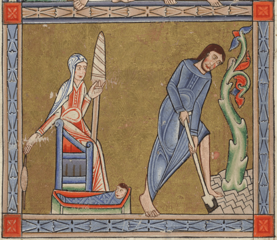 I often see this above particular image of Eve spinning from the Huntarian Psalter being used to argue for either complex embroidery or elaborate closures on the chest and neck of high medieval gowns.